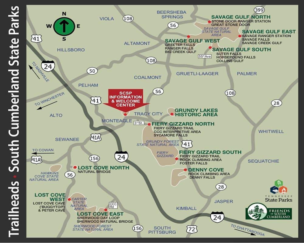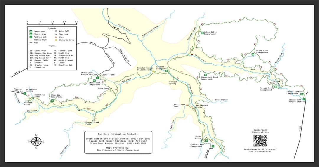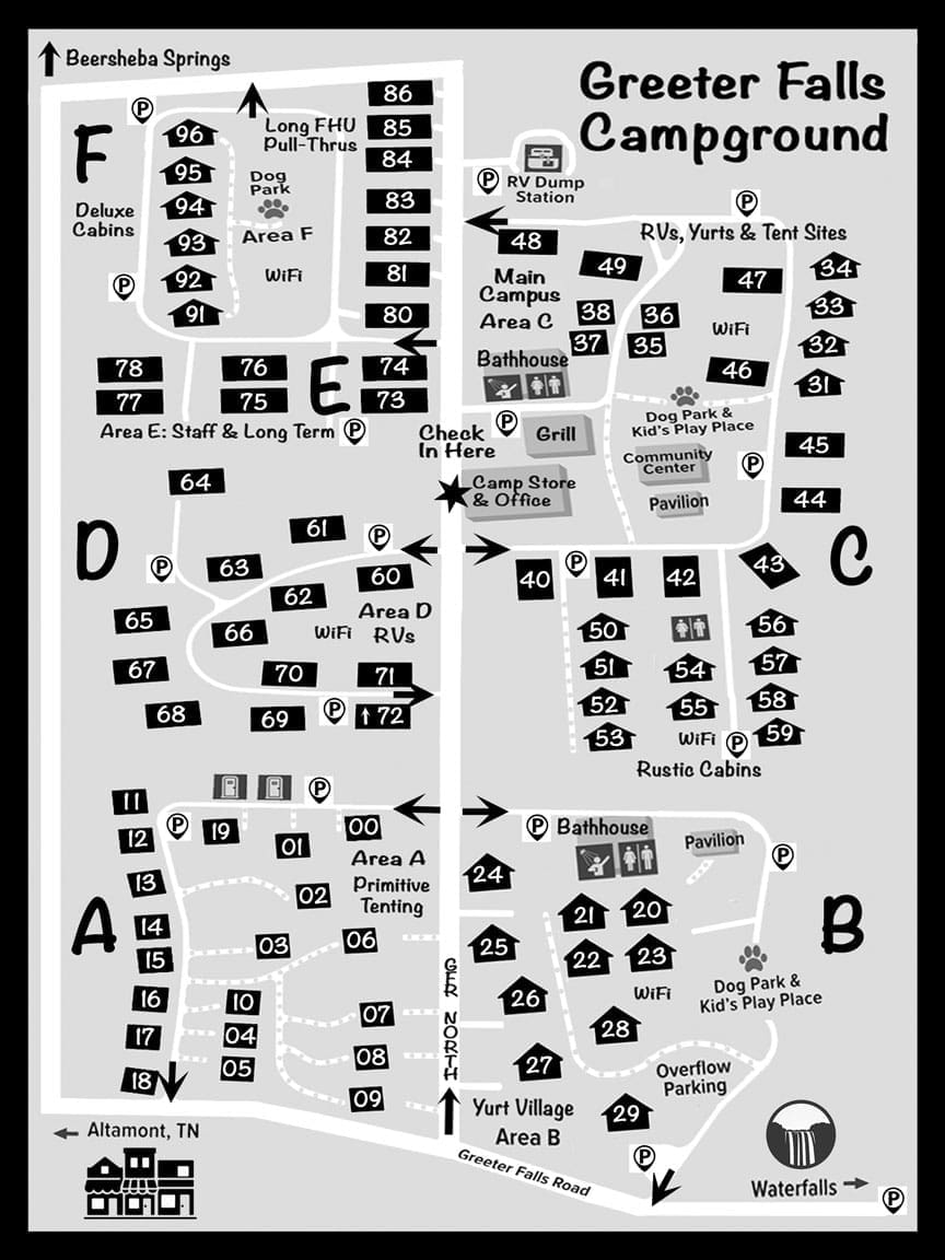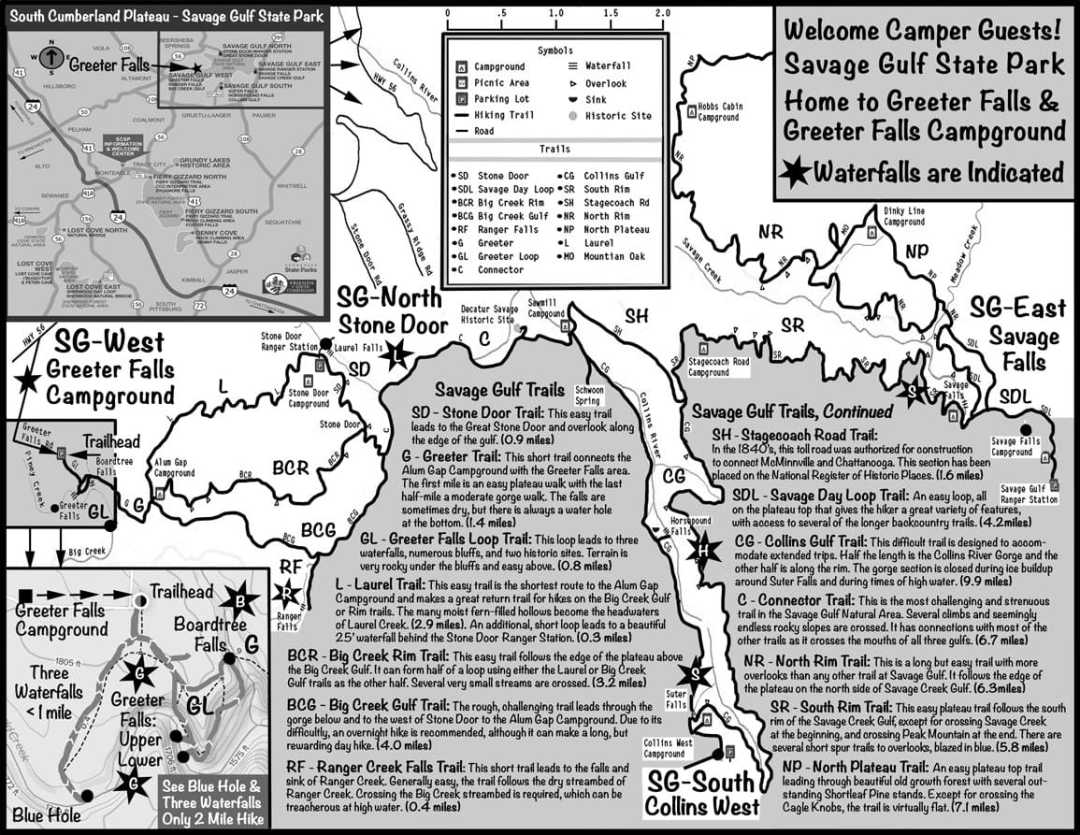 Located in Southeastern Tennessee between Nashville and Chattanooga, our Campground is located less than a half-mile from the Greeter Falls Trailhead, the western entrance to the 16,000 acre Savage Gulf State Park area with fifty miles of well-marked trails for every skill level. The two-mile Greeter Falls Trail loop connects you to Three Awe-Inspiring Waterfalls as well as the nearby Blue Hole Swimming Area.