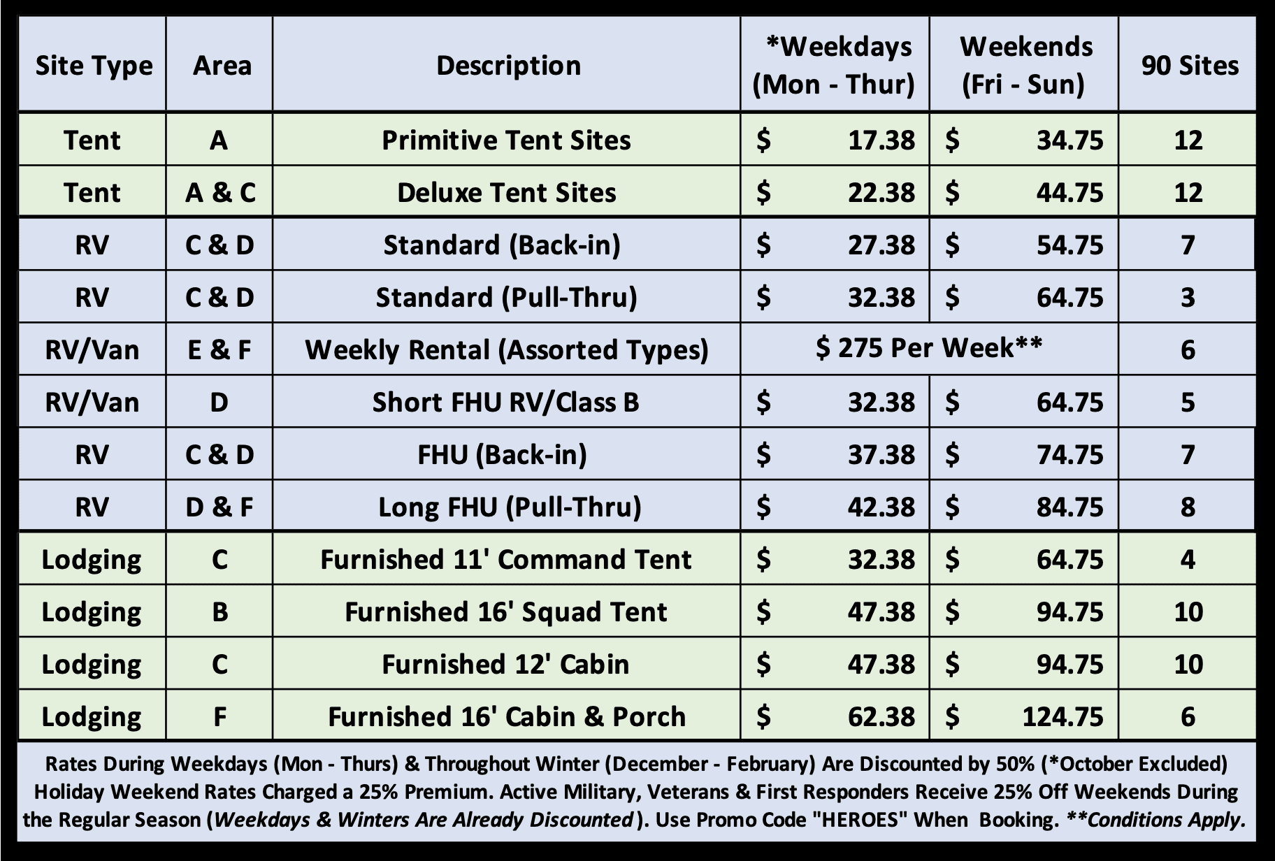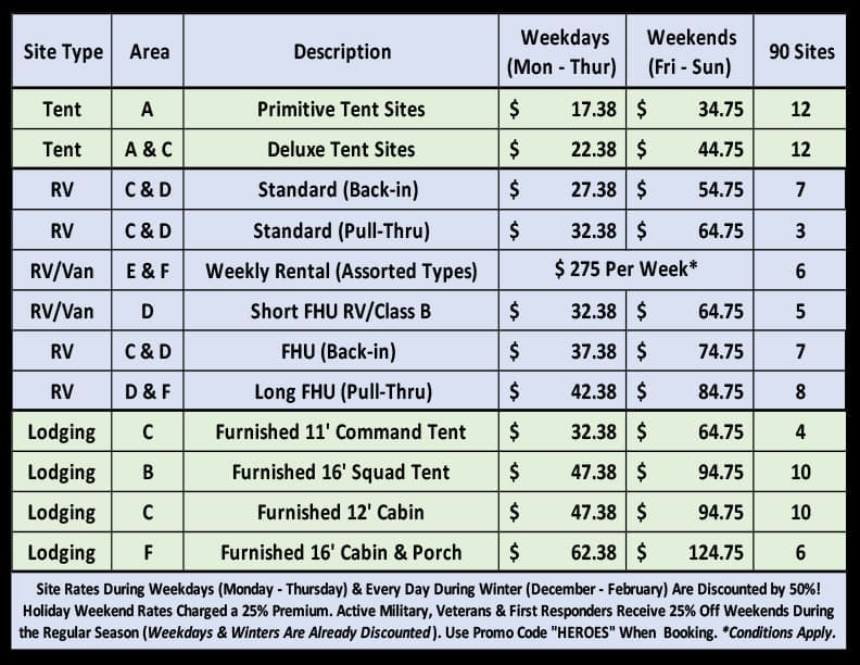 We offer a 25% Discount for our Heroes: Military, Fire & Police. Thank you for your service! Be sure to include the word HEROES (all CAPS) promo code when checking out on CampSpot or when you call.